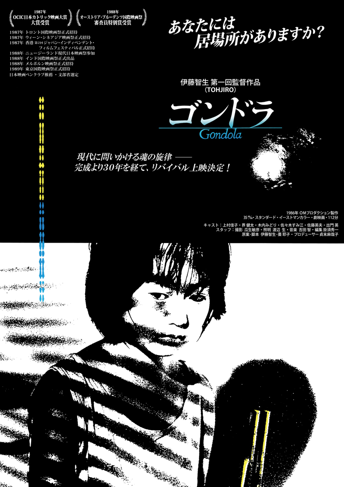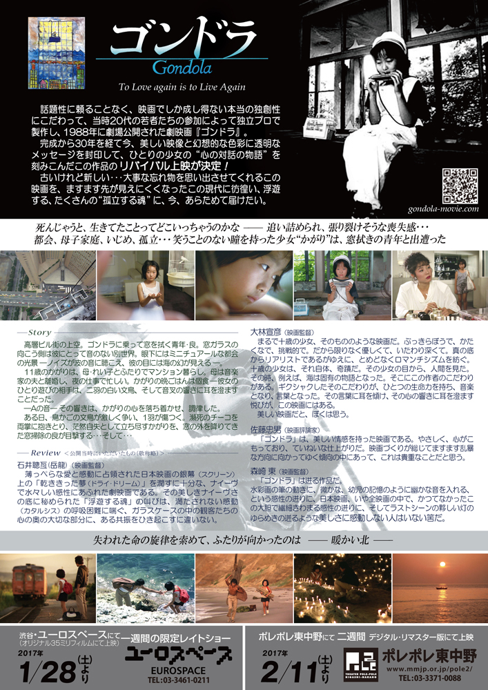 突然のお知らせ、失礼いたします。 30年前に完成し、1988年に劇場公開されました映画「ゴンドラ」が、このたびデジタル・リマスター版にて甦り、1月末よりリバイバル上映されています。 ゚・*:.。..。.:*・゚・*:.。..。.:*・゚・*:.。..。.:*・゚・*:.。..。.:*・゚・*:.。..。.:*・゚・*:.。..。.:*・゚・*:.。..。.:*・゚・*:.。..。.:*・゚・*:.。..。.:*・゚・*:.。..。.:*・゚