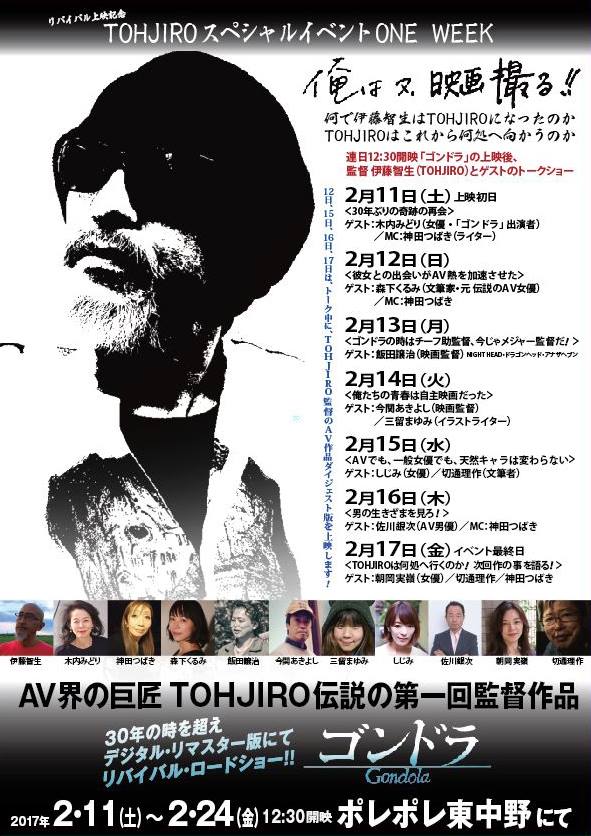 ■ 3月20日(祝)栃木県小山市 生涯学習センターにて ■ 3月25日(土)より 名古屋 シネマスコーレ にて ■ 4月22日(土)より 大阪 シネ・ヌーヴォにてGW公開! *――――*★*――――**――――*★*――――* ■映画「ゴンドラ」予告編 ■映画「ゴンドラ」facebookページ ■映画「ゴンドラ」Twitter *──*──*──*──*──*──*──*──* 紹介サイト -・-・-・-・-・-・-・-・-・-・-・-・- 斎藤工務店(俳優 斎藤 工さんの公式ブログです) ゴンドラ 斎藤 工 -・-・-・-・-・-・-・-・-・-・-・-・- NPO法人 日本子どもソーシャルワーク協会のサイト -・-・-・-・-・-・-・-・-・-・-・-・- シネマズ記事 AV界の鬼才が80年代および現代日本の闇まで予見した名作『ゴンドラ』が30年の時を越えて復活! -・-・-・-・-・-・-・-・-・-・-・-・- シネフィル 「ゴンドラ」関連記事一覧 ■「AVの巨匠TOHJIRO(伊藤智生) 伝説の長編処女作 『ゴンドラ』 30年ぶりの再上映が決定!美しい映像−孤独な少女の“心の対話の物語”」 ■「30年前ー”静かな騒動”を巻き起こした幻の『ゴンドラ』が再上映!伊藤智生監督に聞く@ー時代の閉塞感の中に取り残された子供たちは今も多くいるー」 ■「リバイバル上映に期待高まる『ゴンドラ』!TOHJIROこと伊藤智生監督が森崎東監督に怒られたことAーそして今語る、この映画に秘められた警告とはー」 ■「1月27日深夜に、ジャンルを超えた人達が集結!映画『ゴンドラ』28年ぶりの奇跡の公開に向けてカウントダウン、ミッドナイト前夜祭が開催!」 ■「『ゴンドラ』公開前夜ーTOHJIRO監督決意表明!28年ぶりの再上映に映画監督として復活、そして新作を撮ることを手記で表明!」 ■「「何百何千本観なくても この一本だけ観たい そんな作品」と斎藤工がコメントー30年の時を超え新しい世代にも”響き”だした映画『ゴンドラ』」 -・-・-・-・-・-・-・-・-・-・-・-・- *――――*★*――――**――――*★*――――*