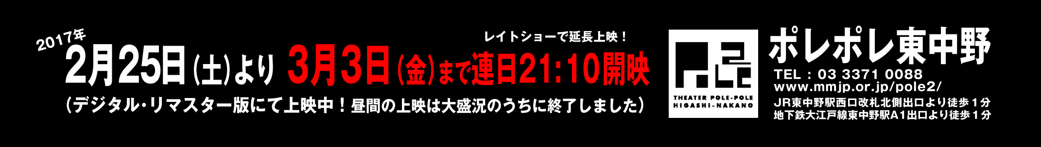 <映画「ゴンドラ」リバイバル上映詳細> ■ 都内第一弾上映は、2月3日(金) で、渋谷ユーロスペースにて(オリジナル35ミリフィルムで上映)終了しました。 ■ そして、いよいよ 都内 第二弾は 2月11日(土) 〜 2月24日(金) まで連日12:30 開映 ポレポレ東中野 にて イベント付上映の第一週と、昼間の上映・第二週目(デジタル・リマスター版による上映)も大盛況のうちに終了し、